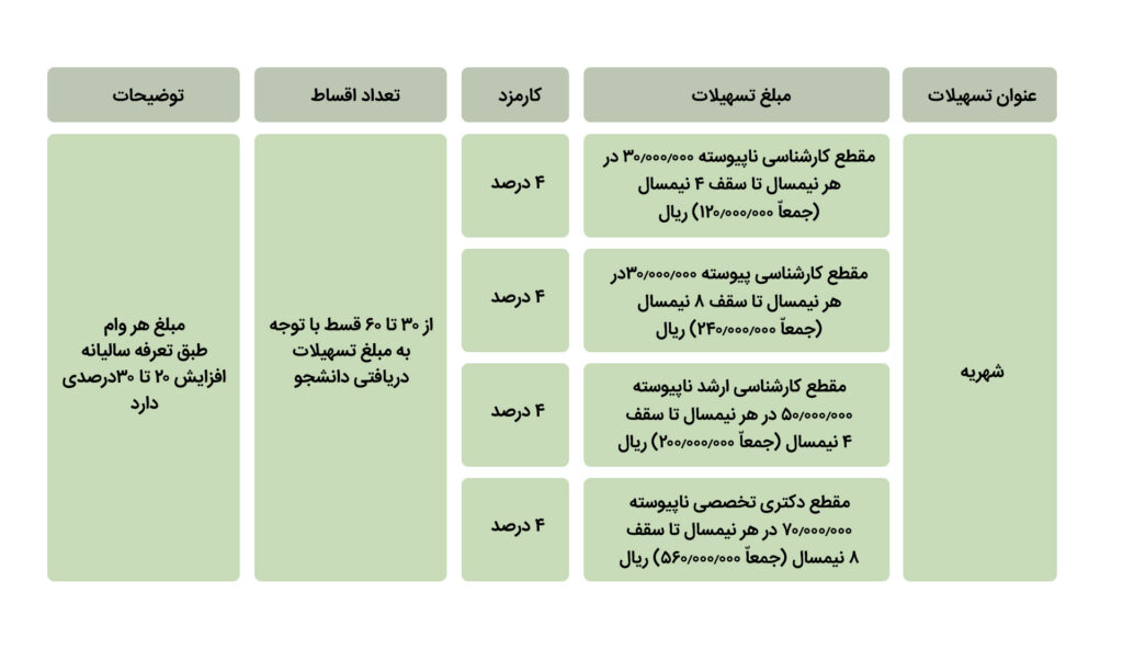 تسهیلات اداره رفاه و تسهیلات دانشجویی در قالب ردیفهای اختصاصیافته مقاطع دکتری، کارشناسیارشد و کارشناسی بهصورت وام شهریه به شرح جدول زیر به دانشجویان ارائه میشود (برای سال تحصیلی 1403-1404).