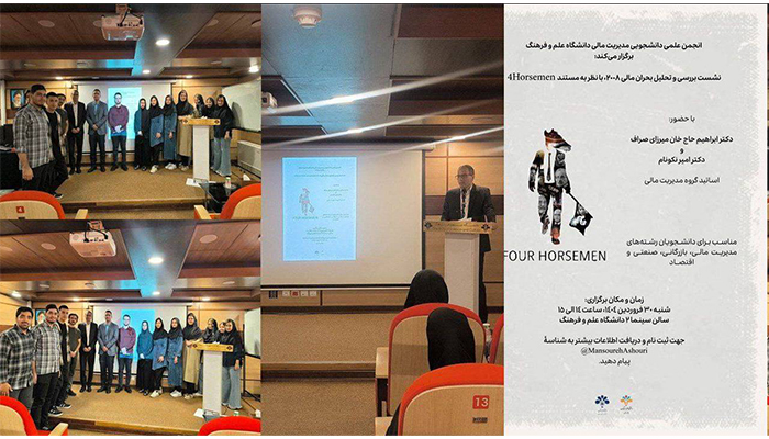 جلسۀ نقد و بررسی مستند چهار سوارکار به همت انجمن علمی و دانشجویی مدیریت مالی دانشگاه علم با حضور دانشجویان و استادان گروه مدیریت مالی روز ۳۰ فروردین ۱۴۰۴ در سالن سینما 2 دانشگاه علم و فرهنگ برگزار شد.